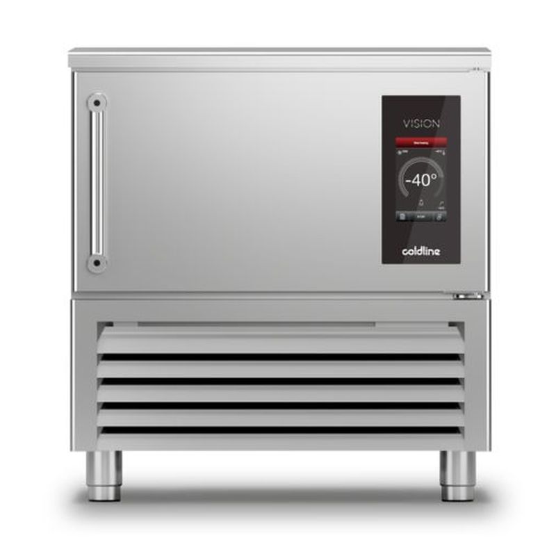 Coldline Vision. Cellule de refroidissement mixte multifonctions, groupe ventilé logé, chaudière à humidificateur. Capacité 6 niveaux acceptant des grilles au format GN 1/1 ou 60 x 40. Profondeur 700 mm. Deux modèles: modèle F à températures de travail de -40°C à + 65°C, ou modèle Nuvō à températures de travail de -40°C à +65°C, permettant la pasteurisation ou la cuisson à basse température. Fonctions Vision communes aux 2 modèles: refroidissement raide, congélation rapide, cycle manuel, décongélation, pousse contrôlée, cristallisation (chocolats, pralines), dessication, yaourts maison + fonction assainissement de l’enceinte à la vapeur. Rendements: refroidissement rapide 21 Kg de +90°C à +3°C – congélation: 15 Kg de +90°C à -18°C.
