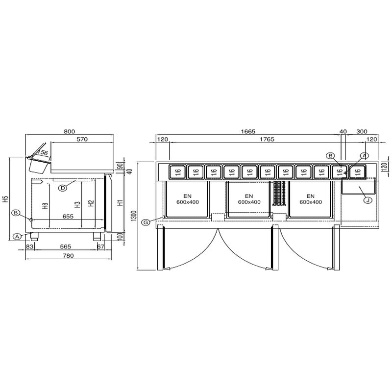 Meuble de préparations froides conçu pour une production mettant à disposition tous les ingrédients à portée de main en un seul meuble. Dessous 3 portes pour grilles ou plaques de format 600 x 400 (Euronorme) pour le stockage réfrigéré des matières premières, dessus pour la fabrication, composé d’un plan de travail inox ou granit et d’un conteneur pour le stockage des ingrédients en bacs GN 1/6 profondeur 150 mm maximum réfrigérés, avec couvercle PVC sur charnières. Largeur de la zône de préparations 570 mm. Profondeur du meuble 800 mm.