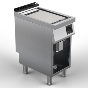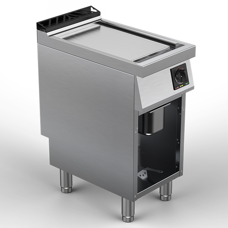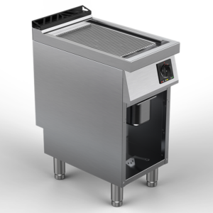 Plancha acier chromé professionnelle, gamme 700 électrique, sur rangement ouvert. Module en largeur 400 mm, 1 zône de cuisson. 3 modèles dans la gamme: plaque lisse chromée satinée – plaque chromée lisse polie – plaque chromée nervurée satinée. Plaque de cuisson acier affleurante, épaisseur 15 mm, encastrée sur le dessus du module, avec goulotte périmétrale étanche d’évacuation des graisses et résidus de cuisson et large orifice de récupération dans un bac inox embouti amovible GN 1/3.