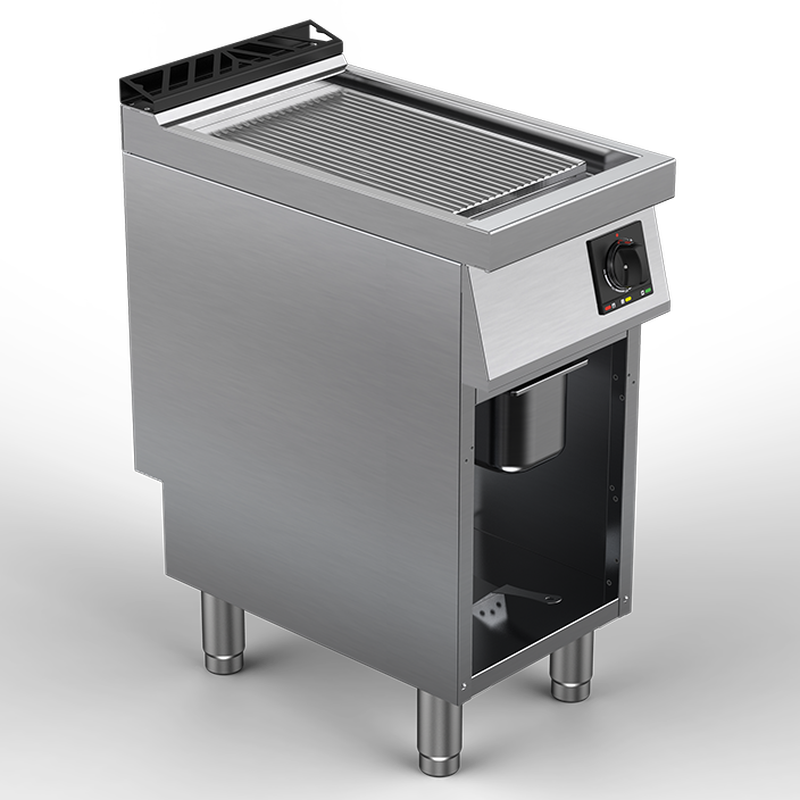 Plancha acier chromé sur placard ouvert. Gamme modulaire 700 électrique. 1 zône de cuisson, chauffée par élément inox pré-assemblé pour une température uniforme sur l’ensemble de la plaque. Boutons athermiques avec voyants de fonctionnement LED intégrés. Plaque de 15 mm encastrée affleurante, lisse ou nervurée. Goulotte de propreté avec évacuation vers bac inox amovible…