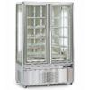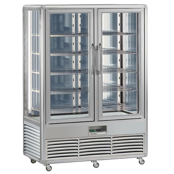 Armoire de présentation de pâtisseries, produits frais en magasin boulangerie, pâtisserie, traiteur, salon de thé, restauration… Volume 1010 litres. 3 faces et 2 portes vitrées, pour une visibilité à 360°. Marque Tecfrigo, gamme Snelle. Aménagement intérieur pour exposition des produits sur grilles ou sur étagères en verre. En dotation: 2 x 5 grilles de dimensions 560 x 555 mm (modèle 1010G) ou 2 x 5 étagères en verre de dimensions 560 x 555 mm.