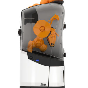 Presse oranges professionnel Minex. Utilisation soit en self service par robinet anti-gouttes, soit en continu par carafe de 75 cl intégrée. Service par simple pression sur bouton. Rendement 13 fruits / minute, 1 jus de 250 ml en 15 secondes. Diamètre de fruits de 65 à 78 mm. Bac à déchets. Technologie ASP anti bactérienne. Coupe sans oxydation…