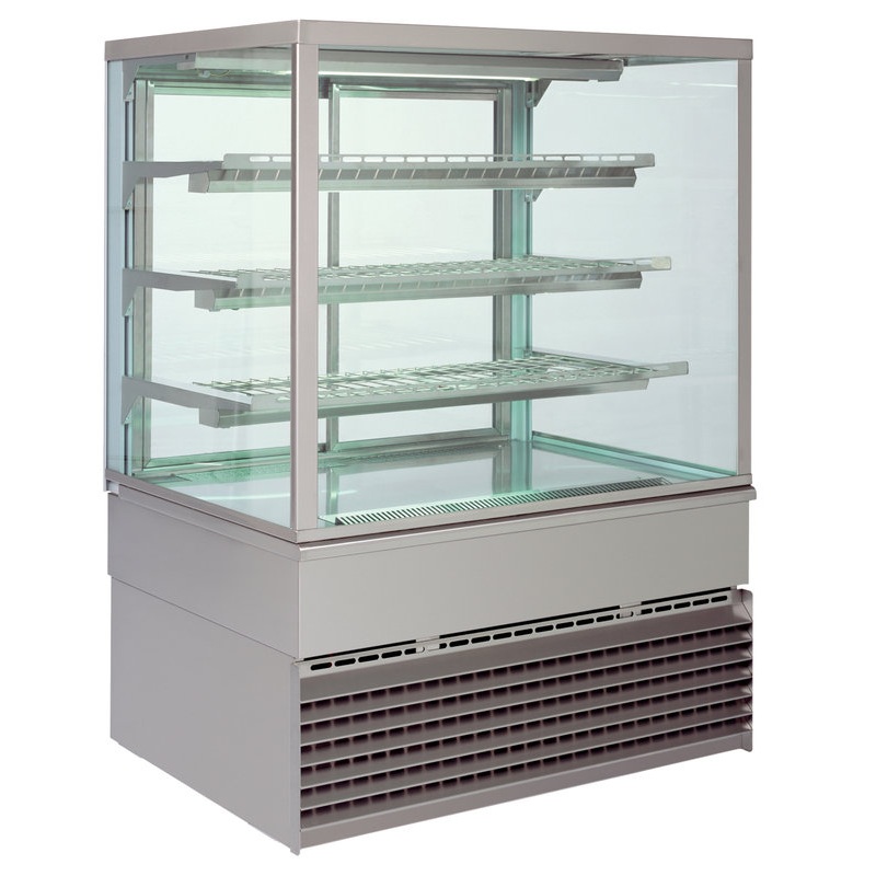 Vitrine réfrigérée « Cold »: froid positif ventilé, groupe frigorifique logé, fluide réfrigérant R 290. Température réglable sur une plage de +4°C/+8°C par thermostat à affichage digital. Dégivrage automatique et bac d’évaporation des condensats. Eclairage LED tous niveaux.