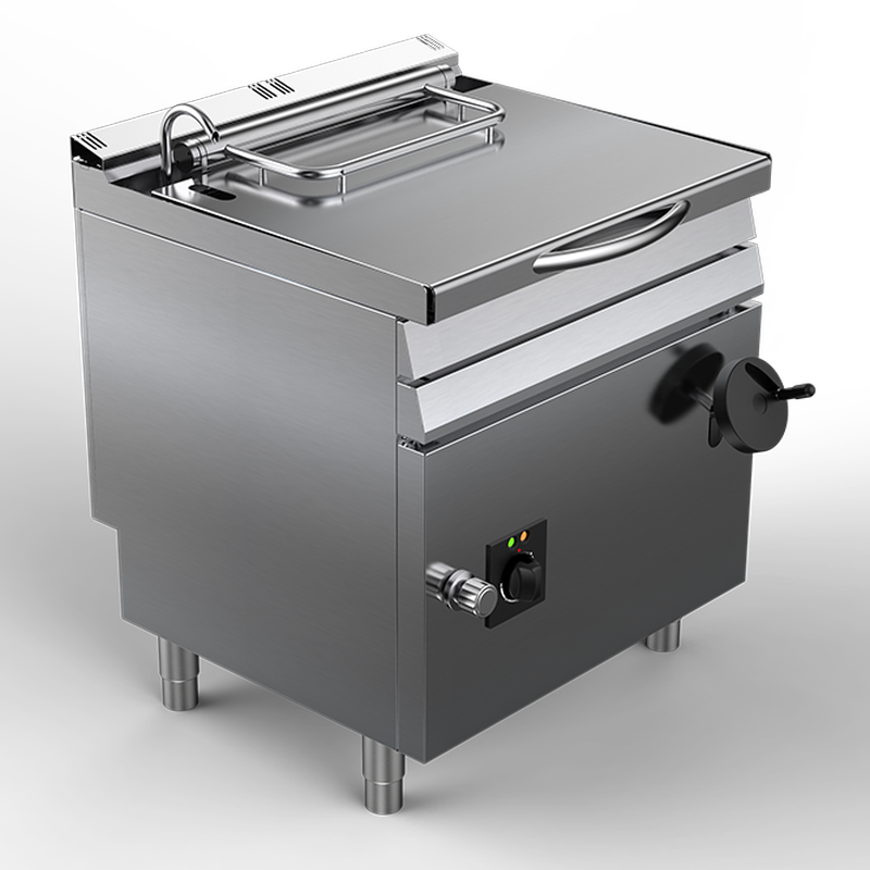 Sauteuse à cuve basculante électrique. Gamme 700. Capacité 50 litres. Surface de cuisson 31 dm². Proposée en version à basculement manuel avec vis sans fin et manutention par bouton moleté en matériau athermique, ou version à basculement motorisé commandé par contacteurs en façade.