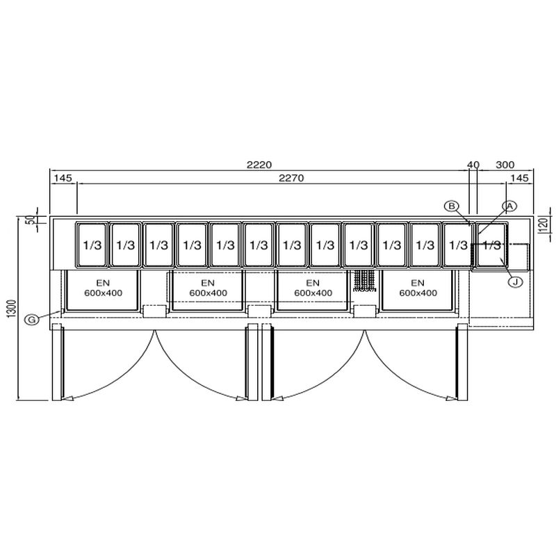 Meuble spécial pour poste de préparations froides. Profondeur 800 mm, longueur 2560 mm. Stockage des matières premières en soubassement 4 portes format 600 x 400. Préparations sur plan de dessus inox ou granit avec zône de travail et conteneur réfrigéré à ingrédients de capacité 13 bacs alimentaires au format GN 1/3. Froid positif ventilé, plage de température de travail -2°/+8°C. Construction inox AISI 304;