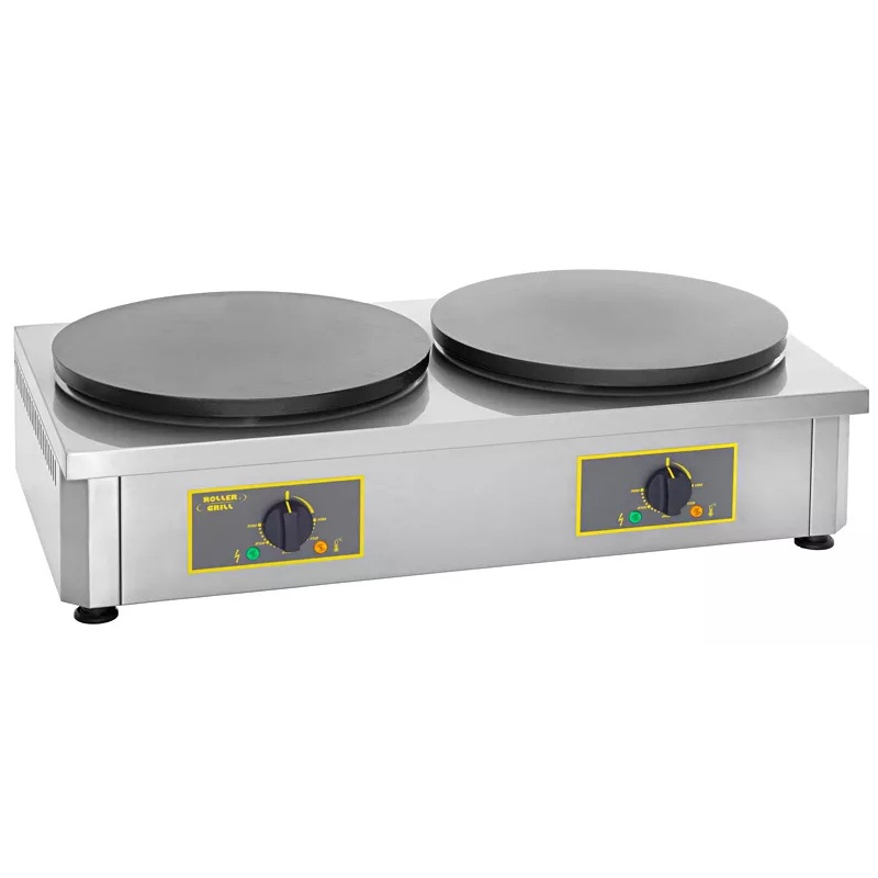 Crêpière électrique double avec châssis. Plaque en fonte émaillée, réduisant sensiblement la phase de culottage et la rendant opérationnelle dès la première cuisson de crêpe. Un léger graissage de la plaque suffit entre chaque cuisson suffit. Deux modèles: 2 plaques x Ø 350 mm / 2 plaques x Ø 400 mm. La plaque assure un excellent transfert de température et permet une véritable cuisson par contact, sans caramélisation ou vitrification. La crêpière électrique CDE permet également de réussir les galettes au sarrasin, les blinis, les tempuras indiennes, chapatis indonésiennes…