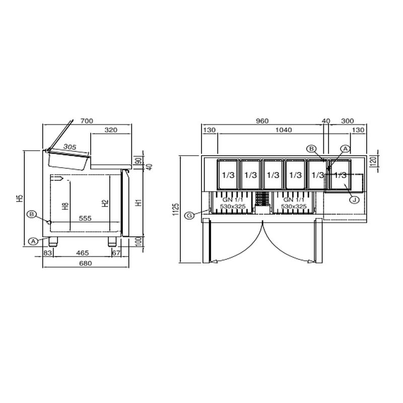 Meuble de préparations froides Prep-Station Coldline. Soubassement réfrigéré 2 portes pour grilles GN 1/1 sur glissières amovibles (2 grilles et 2 jeux de glissières en dotation). Dessus plan de travail inox ou granit, de largeur utile 320 mm. Superstructure conteneur réfrigéré fermé par couvercle en plastique noir sur charnières inox pour la disposition de 6 bacs GN 1/3 de profondeur maximum 150 mm. Hauteur du corps de table 760 mm.