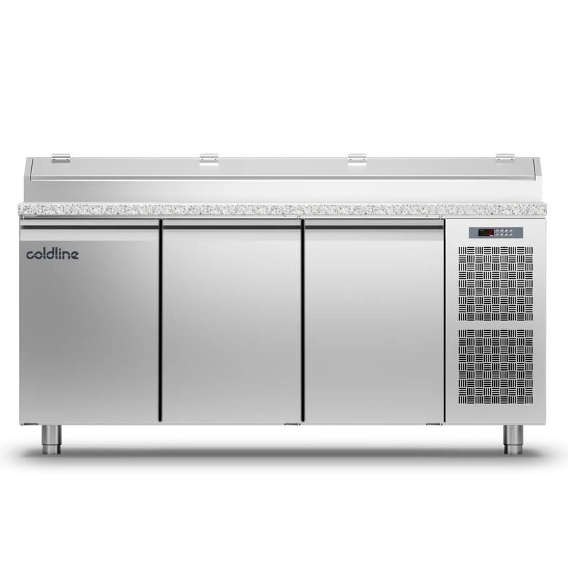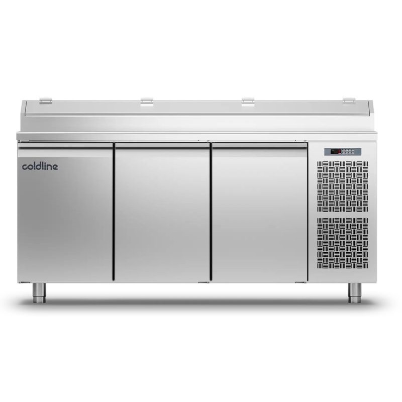 Prep-Station Coldline. Meuble réfrigéré conçu pour les préparations froides. Capacités: 3 portes GN 1/1 en soubassement, 9 bacs alimentaires GN 1/3 de profondeur maximum 150 mm en superstructure avec couvercle à charnières en plastique noir.. Largeur de la zône utile du plan de travail 320 mm.