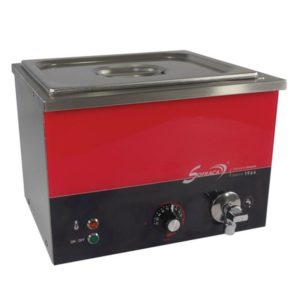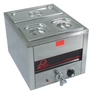 Gamme Tradition. Bain-marie à eau électrique compact à poser sur table de travail. Appareil indépendant pour les cuissons basse température, la remise et le maintien en température des aliments. Permet un chauffage doux, sans dessèchement ni altération du goût ou des qualités organoleptiques des aliments. 1 cuve au format GN 1/1, de capacité 21 litres, prévue pour recevoir des bacs de profondeur 150 mm (bacs non fournis). Vidange par robinet en façade.