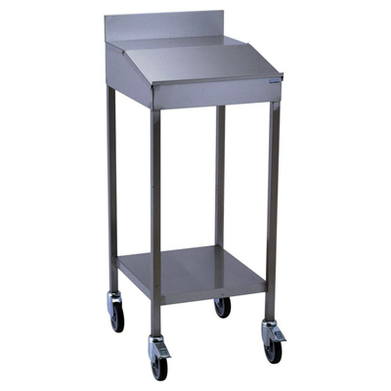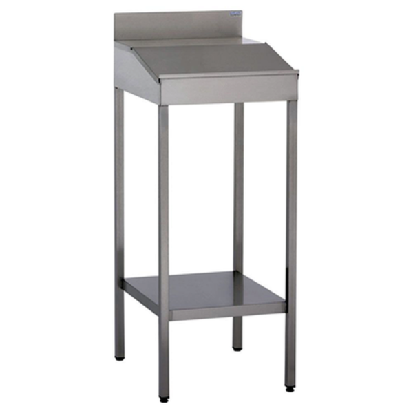 Pupitre inox avec couvercle abattant pour cuisines professionnelles. Construction tout inox alimentaire. Versions: sur pieds avec étagère inférieure, sur roulettes avec étagère inférieure, sur roulettes avec tiroir fermant à clé et étagère inférieure. Piètement en tube inox carré, dosseret arrière….
