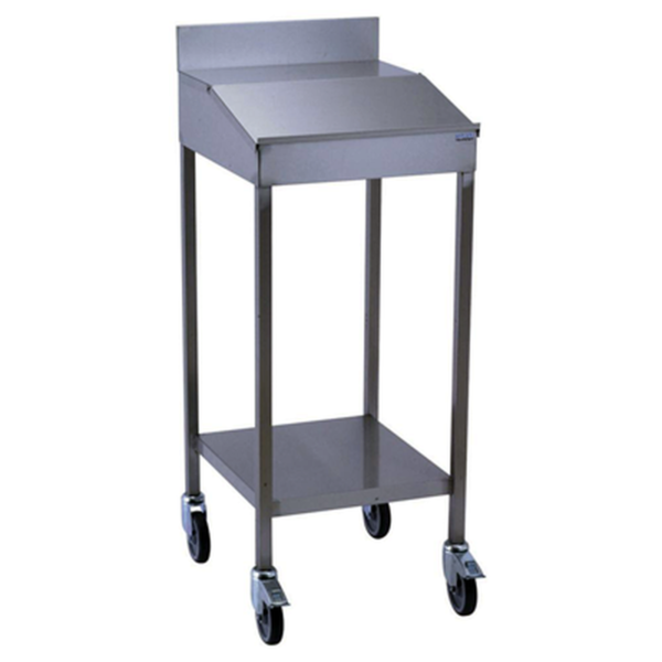 Pupitre dessus coffre avec couvercle rabattable formant plan de travail incliné. Pour utilisation en réception de marchandises, cuisines professionnelles, etc. Réalisation en acier inoxydable alimentaire. Piètement en tube acier inoxydable carré, section 30 x 30 mm. Avec vérins de réglage ou roulettes de diamètre 125 mm dont deux avec frein. Dosseret arrière inox. Etagère inox soudée en soubassement. Hauteur 1300.