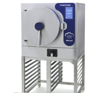 Four vapeur à pression Metos Marvel T1. Pression 1 bar. Température réglable de 40°C à 120°C. Capacité 4 bacs GN 1/1 en profondeur 65 mm ou 3 bacs GN 1/1 en profondeur 100 mm. Construction inox, cavité ronde. Commandes digitales: programmation des recettes par le chef (espace mémoire 10000 programmes), fonction recettes en favoris, transfert USB. Porte à ouverture ergonomique. Soupape de sécurité 1,5 bar…