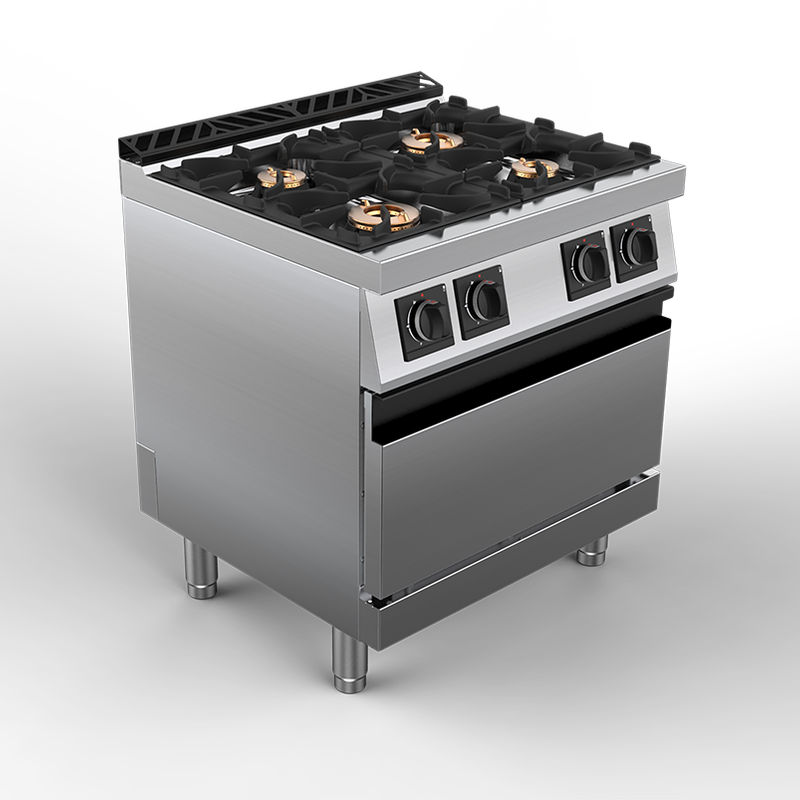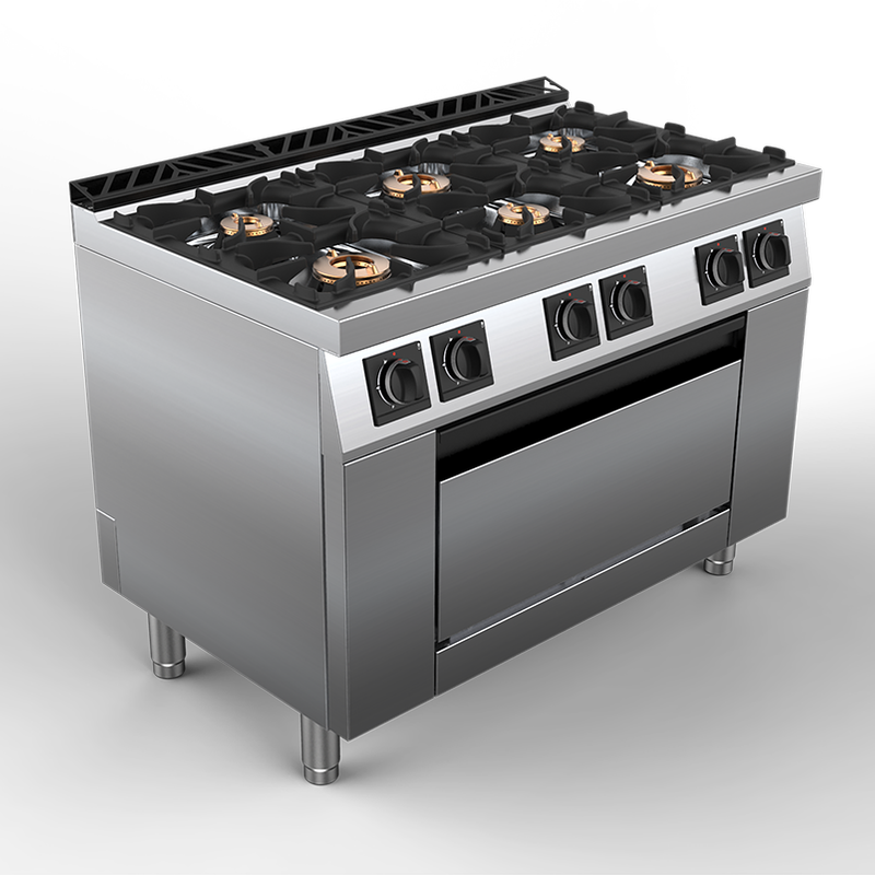 Cuisinières professionnelles au gaz sur four gaz GN 2/1; 2 capacités: 4 feux largeur 800 mm, avec brûleurs double couronne (2 x 4,5 kW- 2 x 7,5 kW) ou brûleurs coniques (4 x 8 kW), ou 6 feux largeur 1200 mm avec brûleurs double couronne (3 x 4,5 kW – 3 x 7,5 kW). Soubassement four gaz de 7,7 kW pour 3 grilles inox GN2/1, allumage piezzo. Chambre de cuisson inox. Porte isolée double paroi. Système de ventilation naturelle de l’ensemble du fourneau…