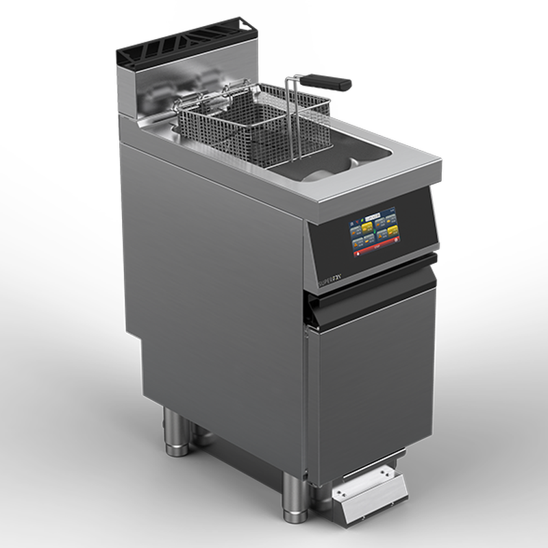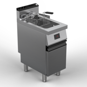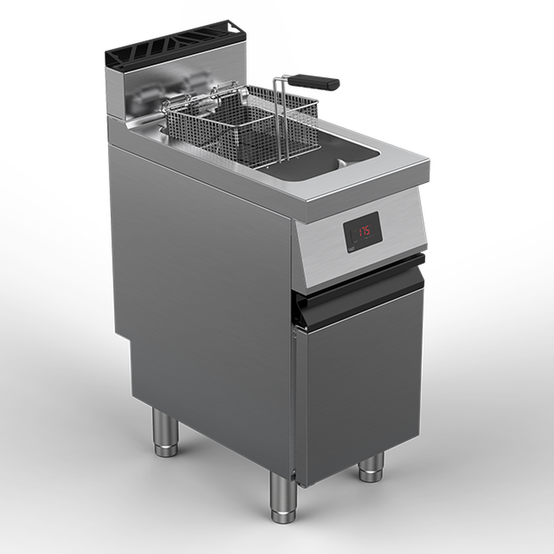 Friteuse gaz sur placard. Cuve à zône froide. Capacité 15 litres. Modèles haute performance. 3 niveaux de prestations au choix: modèle standard avec contrôle de température manuel, modèle Fast avec contrôle électronique de température à +/- 1°C, modèle Touch Screen avec gestion électronique complète des paramètres de cuisson ( système adaptatif constant de la température à +/- 1°C par PID pour un meilleur traitement du produit sans écarts de température, et à moindre consommation d’énergie).