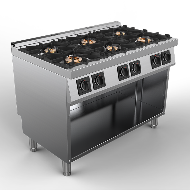 Modules 6 feux gaz, Offcar gamme Milo 700. Largeur 1200 mm. Disposés sur support neutre sans porte, avec plancher, ou élément dessus seul à poser. Choix entre 6 brûleurs à double couronne (flamme diffuse, 4,5 et 7,5 kW) ou brûleurs coniques (flamme verticale, chaleur concentrée, 8 kW). Construction intégralement en inox AISI 304. Système de ventilation naturelle diminuant la température à l’iintérieur des modules…