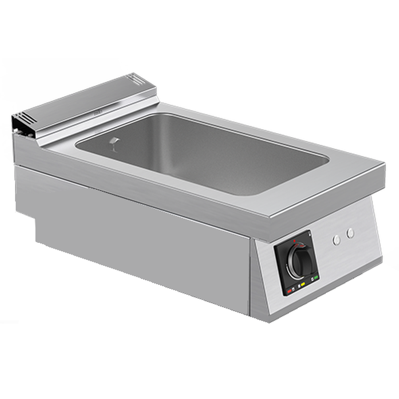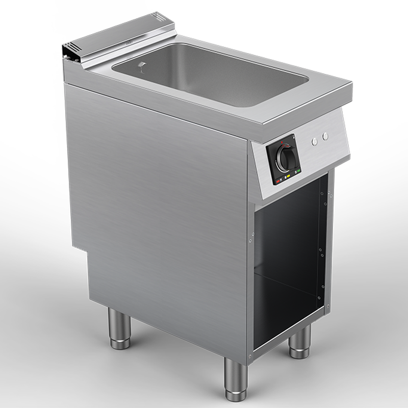 Cuve emboutie, en acier inoxydable AISI 304, à rebords largement arrondis pour assurer un nettoyage facile et de qualité. Cuve de 160 mm de profondeur adaptée aux récipients de format standard GN 1/1 jusqu’à 150 mm de hauteur. Remplissage de l’eau directement dans la cuve à travers une électrovanne commandée par bouton poussoir en façade, avec distributeur en acier inox AISI 304. Robinet de vidange avec contrôle frontal. Chauffage par élément adhésif à haut rendementfixé sur le fond extéreur de la cuve. Dispositif de sécurité et thermostat intégrés pour une précision maximale. Contrôle de température thermostatique réglable de +30° à + 90°C par manette multipositions à vyants de fonctionnement LED intégrés.
