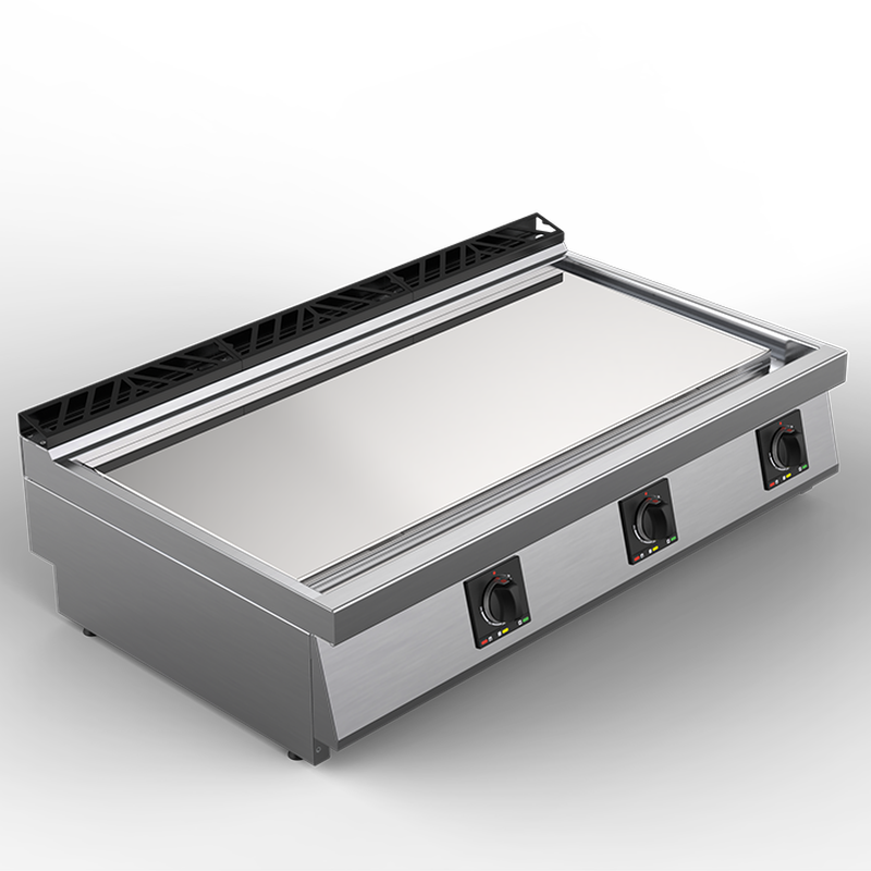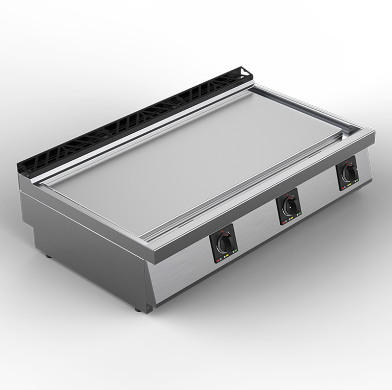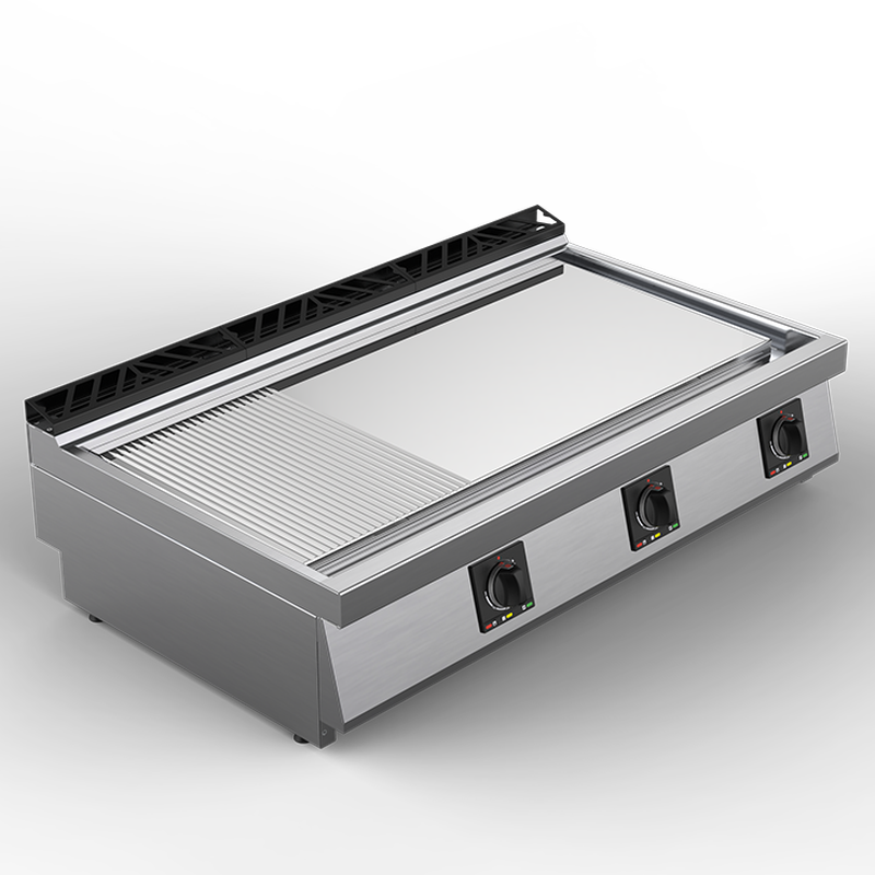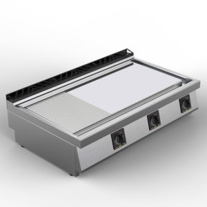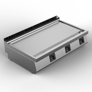 Plaque de cuisson en acier, épaisseur 15 mm. Eléments de chauffe électriques blindés en acier inox AISI 304 en blocs pré-assemblés, disposés pour un rendement idéal et une totale uniformité de la température de cuisson, facilement accessibles à l’entretien ou au remplacement. Fonctionnement à température réglable de 100°C à 300°C par thermostat, avec boutons de commandes à prise ergonomique, en matériau plastique athermique sans traces avec voyants de fonctionnement LED intégrés.