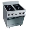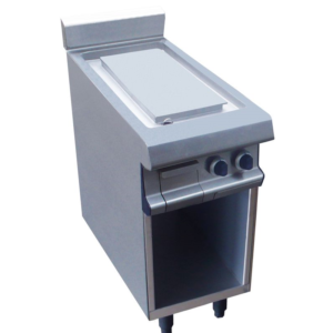 Foyers induction: 2 foyers sous plaque vitrocéramique épaisseur 6 mm, de dimensions 325 x 650 mm. 2 puissances: 2 x 3,5 kW et 2 x 5 kW. Commande par interrupteur marche / arrêt. Modulation de puissance, avec régulation par potentiomètre réglable de 0 à 9. Détection des récipients. Voyant témoin de chauffe à LED. Sécurité thermostatique.