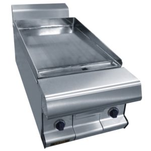 Demi bloc de cuisson grillade plaque lisse horizontale inox. Gamme Celtic. Pour cuissons de type plancha. 1 zône de cuisson. Largeur de façade 400 mm. Energie gaz ou électrique. Modèles en dessus seul à poser, en dessus sur placard neutre ouvert ou fermé, en dessus sur placard fermé chauffant.