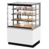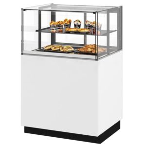 4 niveaux de présentation, dont 3 étagères affinées en verre, réglables en hauteur et en inclinaison. Eclairage LED sur chaque niveau, restituant les couleurs naturelles des produits exposés. Surface d’exposition optimisée à 2,19 m², pour une capacité de 30% supérieure à des vitrines de même longueur. Conception étudiée pour permettre une vue panoramique totale sur les produits pour le client: 4 faces et dessus vitrés, portes vitrées coulissantes à fermeture amortie à l’arrière, pas de montants de jonction d’angle des vitres occultant une partie de la vision. Utilisation de verre thermique favorisant l’isolation de la vitrine pour un maintien de température constant des produits sur une longue durée, tout en limitant la consommation d’énergie et les risques de gaspillage des produits.