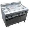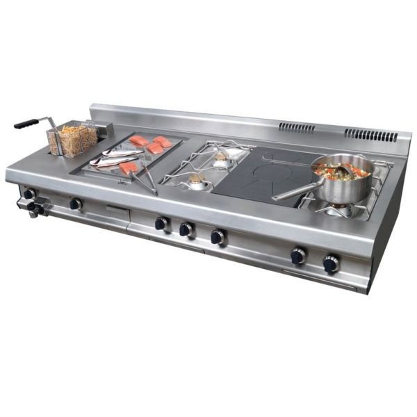 Fourneau dessus à poser compact non modulable. Composition: 2 feux nus , 1 plaque coup de feu gaz en fonte, 2 feux nus, 1 plancha grill électrique acier inox, 1 friteuse électrique 8 litres. Brûleurs gaz démontables. Eléments électriques chauffés par résistances inox oblongues à + 30% de rendement. Dessus inox 30/10.