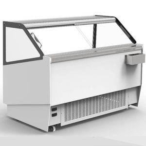 Vitrine réfrigérée horizontale « mixte », à système de réfrigération hybride pour la présentation indifféremment de glaces ou entremets glacés ou de pâtisseries. 2 plages de température, à commandes électroniques différenciées. Groupe froid intégré. 3 capacités en bacs à glace vrac. Vitrine fermée, sans réserve. Superstructure verre. Service arrière par portes coulissantes…