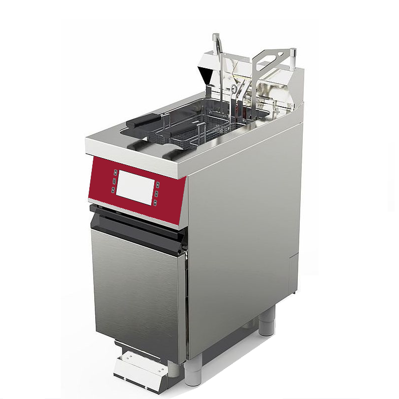 Friteuse électrique à haut rendement. Bloc module en profondeur 900 mm. 1 cuve de 20 litres. Variantes d’équipements: relevage automatique de paniers – filtrage de l’huile à chaud entre cycles avec remise à température en moins de 4 mn. Gestion électronique programmable. Cuve à zône froide. Adaptation automatique de la puissance: haut rendement et Eco. Nettoyabilité parfaite…