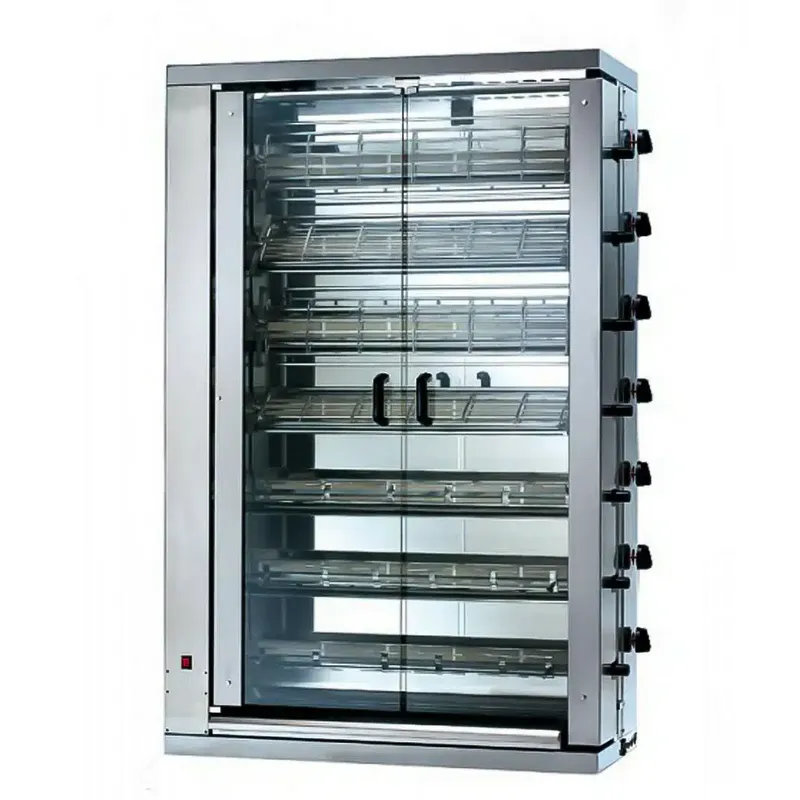 Rôtissoire pour la cuisson de poulets ouverts en crapaudine . Equipée de 7 broches spéciales de longueur utile 850 mm, équipées de poignées en matériau athermique pour simplifier et sécuriser la manipulation. . Alimentation électrique en 400 Volts ou gaz butane/propane. Rôtissoire à chaîne et pignons acier pour un entraînement synchrone de toutes les broches assurant une cuisson uniforme de toutes les pièces. Vitesse de rotation des broches pré-déterminée d’usine.
