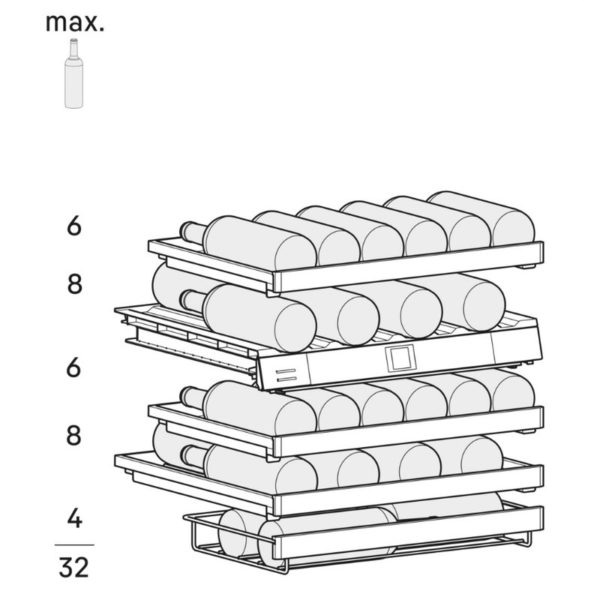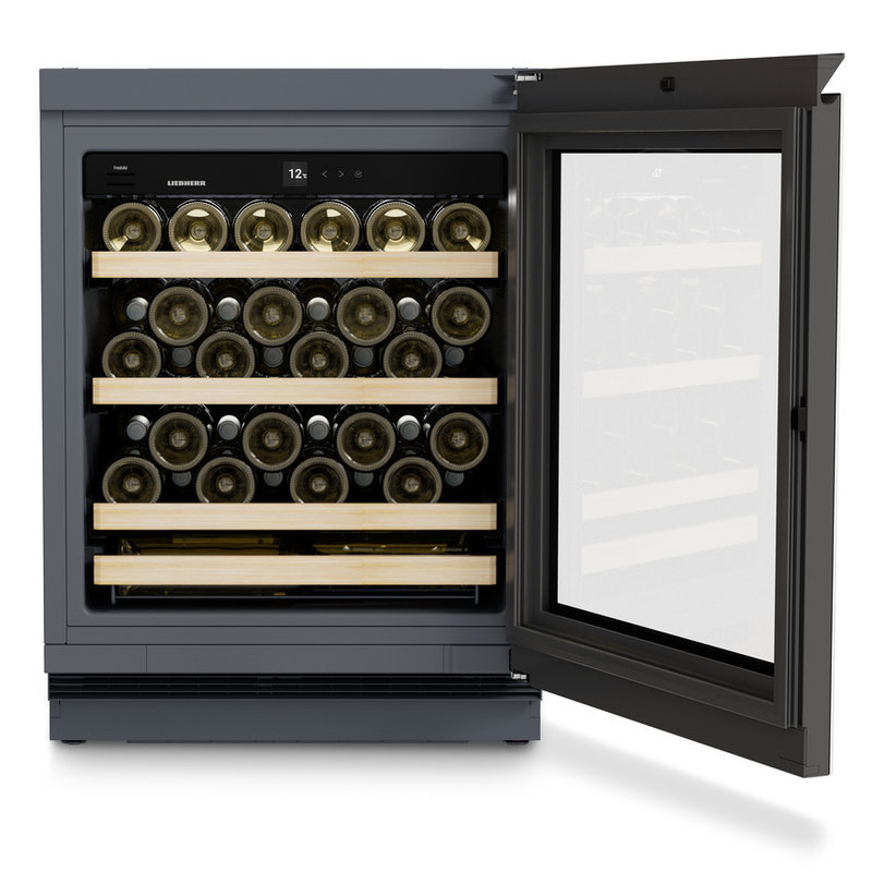 Liebherr Vinidor. Réfrigérateur à vin conçu pour le maintien des bouteilles à bonne température et dans les conditions idéales de stockage. Cave à vin adaptée à une installation sous comptoir. Capacité 32 bouteilles de type bordeaux sur 5 niveaux. 2 zônes de températures indépendantes pour stocker différents types de vins. Température réglable entre +5°C et +20°C, contrôlée en continu par le système à 2 capteurs TemProtect Plus évitant toute variation de température, avec alerte de changement critique. Commandes intuitives par écran tactile à cristaux liquides verrouillable, avec affichage permanent de la température. Possibilité d’installation ultérieure du système SmartDevice Box, pour une gestion des paramètres à distance et réception des alertes sur smartphone (option).