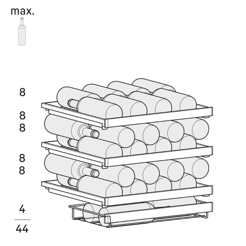 Armoire de mise à température de vins, gamme Vinidor, encastrable sous comptoir. Capacité 44 bouteilles de type « bordeaux ». Température réglable de 5°C à 20°C. Commandes verrouillables. Porte vitrée anti-UV, compresseur spécifique sans vibrations, clayettes sur rails télescopiques « soft ». Neutralisation des odeurs externes par filtre à charbon. Sécurités température anormale, porte ouverte…