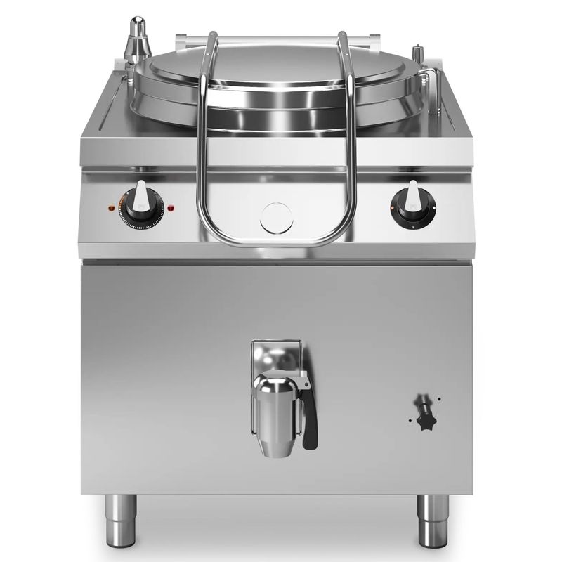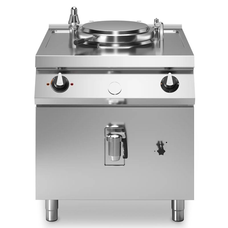 Marmites bain-marie électriques, gamme 900, contenances 50, 100 et 150 litres. Blocs de cuisson indépendants, en largeur 800 mm, intégrables à un ensemble de cuisson de la gamme Roc 900, avec système de double jonction permettant un alignement parfait aux autres modules.