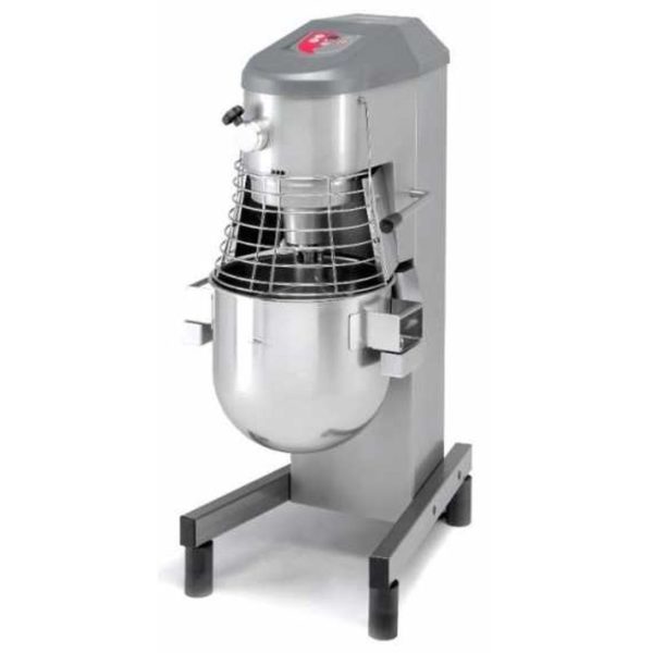 Batteur mélangeur planétaire, sur support colonne. Cuve de 30 litres. Contenance: 9 Kg de farine pour 60% d’eau. 3 modèles: sans accessoires colonne standard, sans accessoires colonne inox, avec prise d’accessoires colonne standard. Branchement monophasé. Commandes électroniques: minuteur 0-30 minutes, variateur de vitesse, travail en continu. Montée et descente de cuve par levier…
