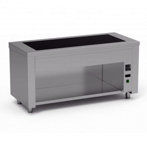 Le meuble dessus chauffant existe en dessus inox chauffé par résistances plaquées en sous face, ou en dessus avec intégration de plaques chauffantes de préférence en verre vitrocéramique, intégrées au plateau ou indépendantes, avec plateau décaissé à l’arrière. Dans tous les cas, il est nécessaire d’assurer un complément de chauffe en partie supérieure, intégrée à l’étagère passe plat, soit par lampes chauffantes infrarouges, soit par rampes céramiques.