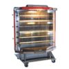 Rôtissoire traditionnelle électrique. Equipée de vitres bombées pour une vision panoramique des produits et une cuisson spectacle au vu de la clientèle, en limitant le rayonnement de chaleur. 3 capacités de production, pour un rendement horaire moyen de 24, 36, ou 48 poulets, sur 4, 6, ou 8 niveaux de broches. Broches horizontales « Rapid-Broche » à poignée athermique, pour faciliter l’embrochage et les manipulations.