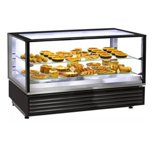 Vitrine chauffante 4 niveaux de présentation, avec 3 étagères verre. Avec humidification, pour produits hors emballage en libre service. Fermeture par portes en verre, arrière et arrière / avant. S’intègre à tous types de disposition et de design de comptoir de vente à emporter. Système exclusif de chauffage par niveau avec réutilisation de l’air chaud…