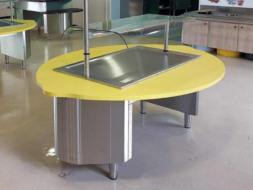 Le self est constitué de meubles de la gamme Mandarine de la Sté Tournus Equipement. La hauteur de 720 mm est la norme ergonomique des meubles de self service « enfants ». Il est prévu pour une capacité de 120 repas / service.