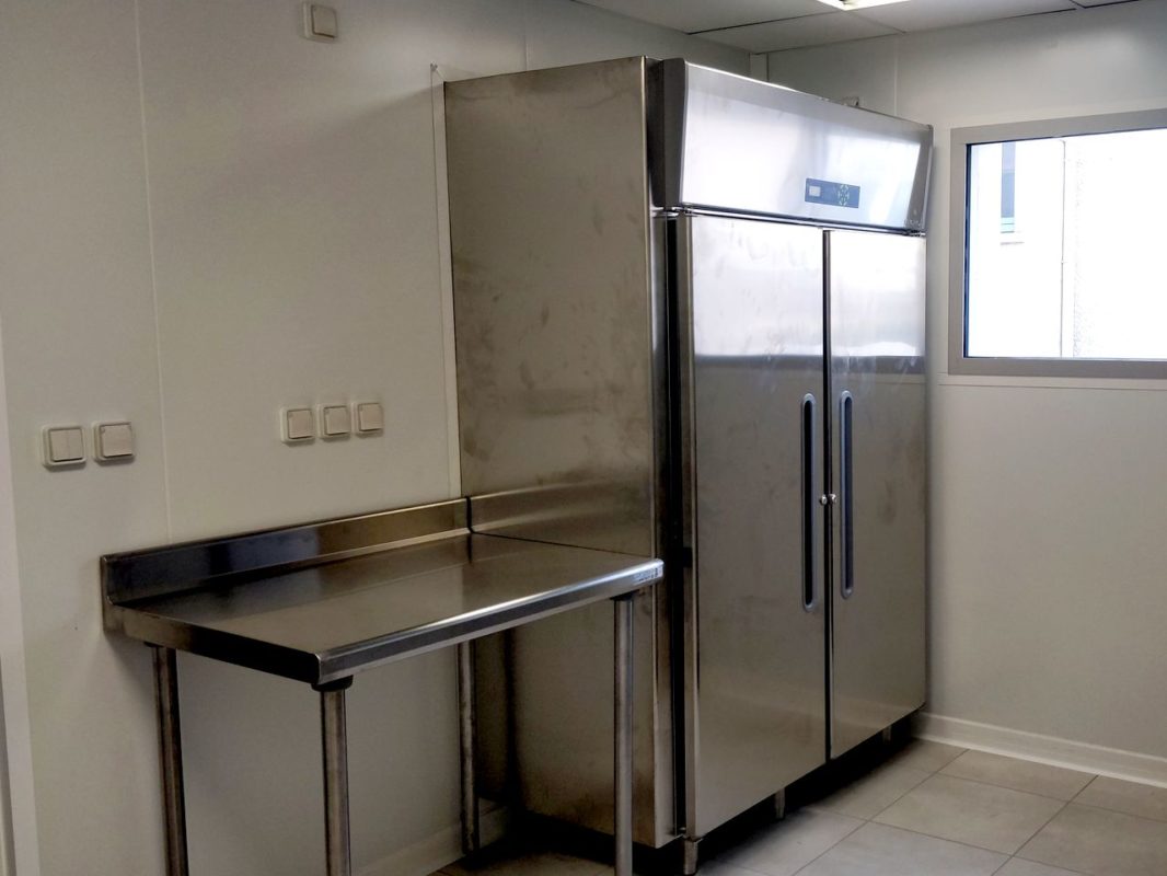 - Office de liaison froide en deux zônes. 1 préparation / dressage des entrées et desserts, avec stockage réfrigéré dans une armoire traversante donnant sur le self – 1 zône de remise et maintien en température des plats chauds et légumes, avec meuble spécifique et transfert au self par un chariot chauffant à hygrométrie contrôlée.