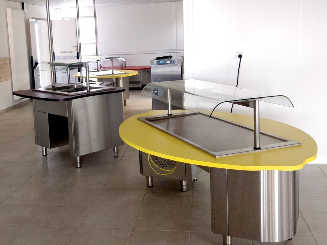 - Self service: meubles indépendants disposés en scramble. Hauteur de plateau surbaissée, alimentation électrique par le plafond, intégrée à des perches inox. Composition du self: 1 meuble distributeur de pain et assiettes mobile, 1 meuble réfrigéré pour entrées froides, 1 meuble réfrigéré desserts, 1 meuble chaud bain-marie à air légumes en bacs GN, 1 meuble chaud bain-marie air pulsé à hauteur adulte pour service des viandes sur assiette par un adulte.