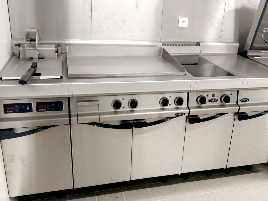 – Cuisson électrique: fourneau dimensions 2000 x 800 mm, composé de 1 friteuse 20 L à relevage automatique, 1 plaque grill lisse 800, 1 double foyer induction, 1 élément neutre, sur soubassements placards neutres fermés – 1 VarioCooking Center 112L, 1 four mixte 10 niveaux GN 1/1.