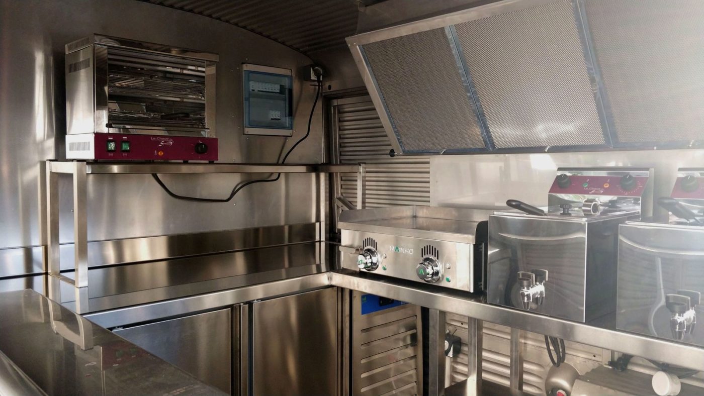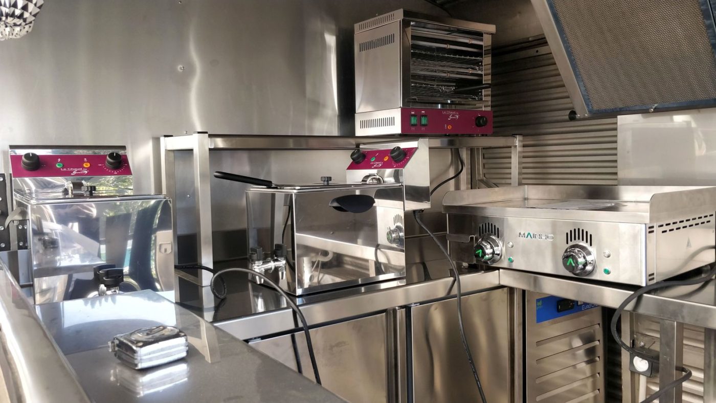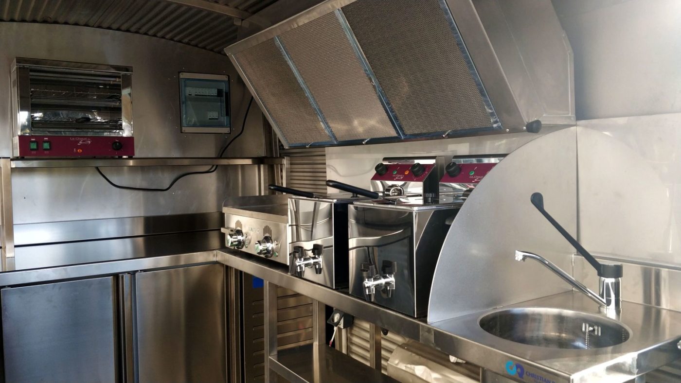 Cuisson: 2 friteuses de table 8 litres avec vidange – 1 plancha lisse au chrome dur, surface de cuisson 24 dm² – 1 toaster / grill à 2 étages – hotte d’extraction dynamique.