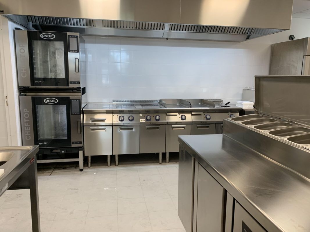 La cuisson: Fours mixtes GN 1/1 superposés – ligne de cuisson électrique (foyers induction, plancha chrome, friteuse 15 litres, éléments neutres, soubassements placards fermés) – cuisine d’envoi (four mixte de remise et maintien en température, planchas) – Extraction cuisine avec hotte statique – Machine sous vide.