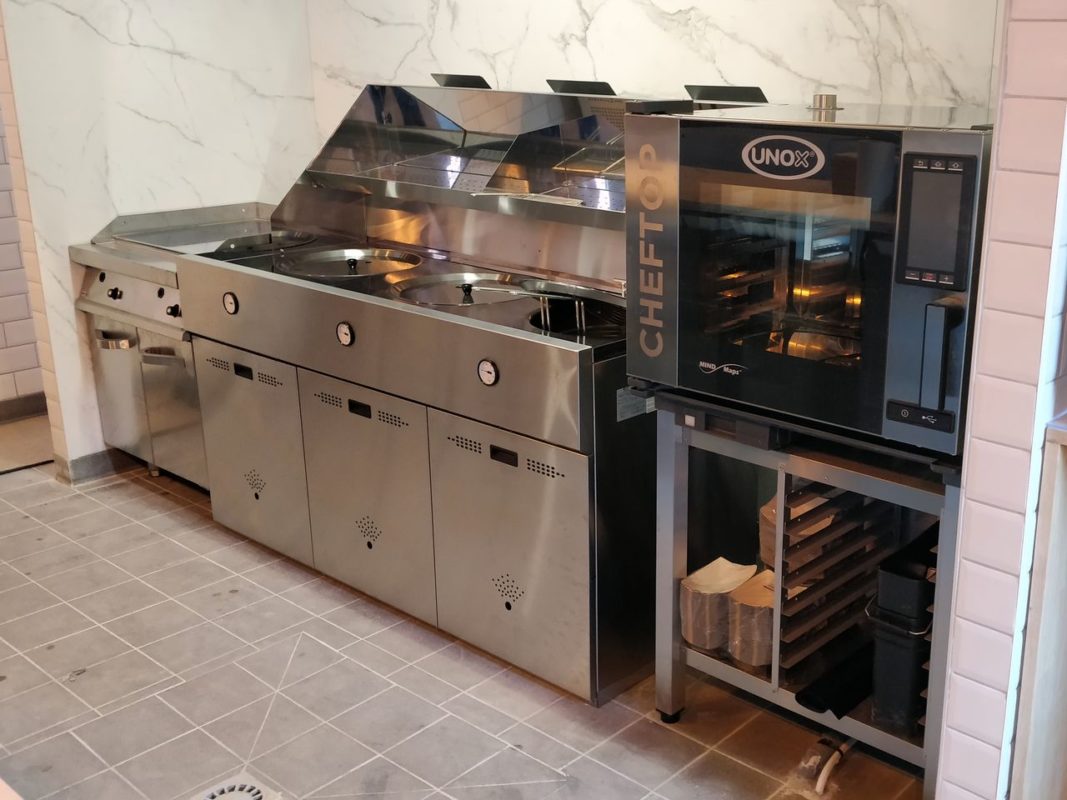 Aménagement du stand avec production en flux tendu, assurée par 1 plancha chrome lisse au gaz de 40 dm² à 2 zônes de cuisson, sur placard fermé – 1 grande friteuse traditionnelle gaz 3 cuves pour des frites fraîches authentiques « ch’tis » – un four mixte électrique 5 niveaux GN 1/1 sur support à glissières – Extraction avec hotte sur l’ensemble.
