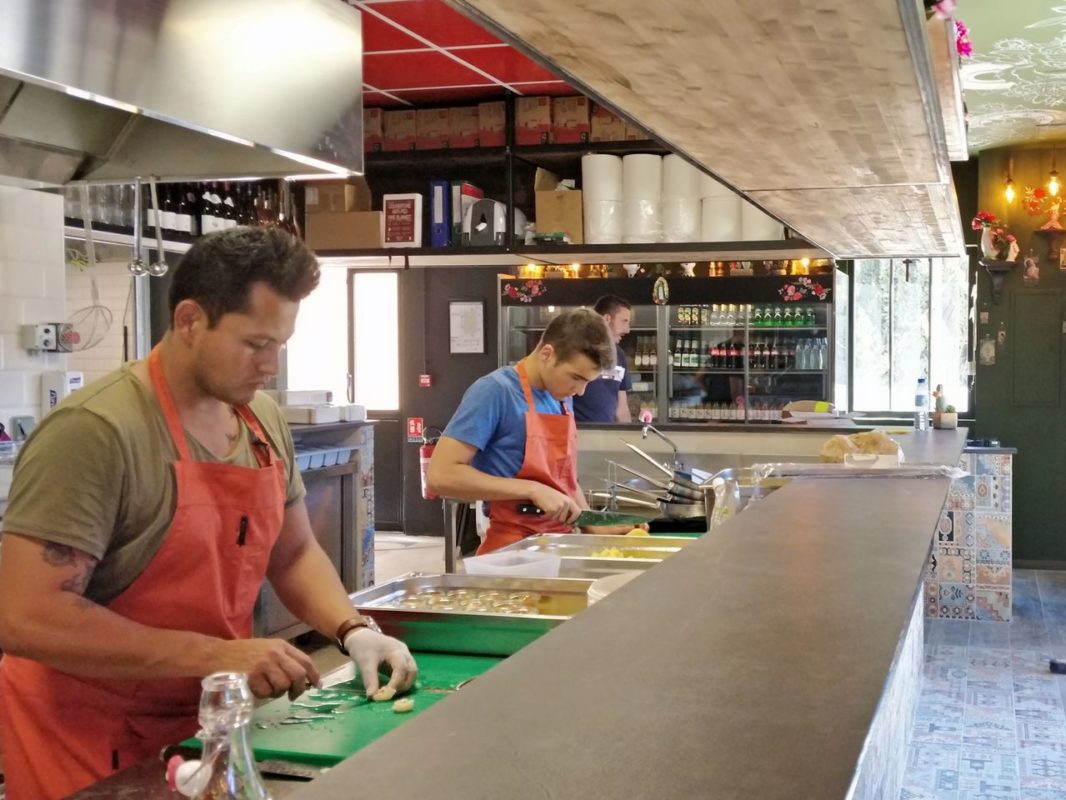 Matériels de cuisson: éléments à poser et pour la plupart déplaçables, correspondant à la variété des produits proposés et à une production rapide en flux tendu. Planchas électriques lisses au chrome, bain-marie, friteuse électrique, gyro grill, plaque de cuisson induction double foyer. Extraction avec hotte et caisson extracteur.