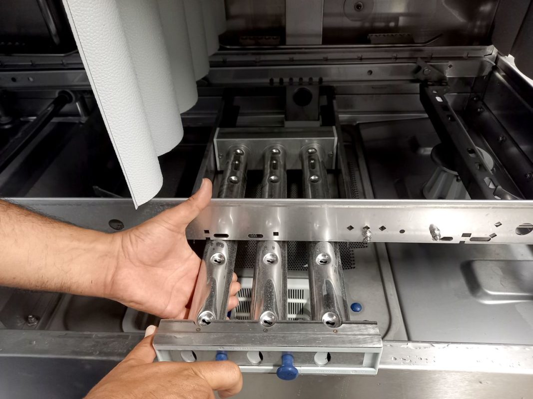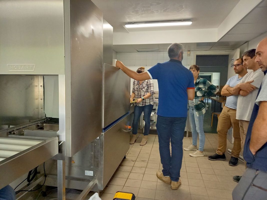 La formation des agents et responsables de la cantine scolaire est assurée par le technico commercial de la société Hobart, avec la présence commerciale de la société Christian Rage, qui a étudié, vendu et installé le lave vaisselle CSA A 12. Après une présentation globale des différentes fonctions de la machine, vient la mise en pratique de la mise en service et du fonctionnement en réel. La formation se termine par les consignes de nettoyage et d’entretien: démontage (sans outil, sans effort) des pièces à nettoyer à chaque fin de service (avec repérages de couleur bleue).