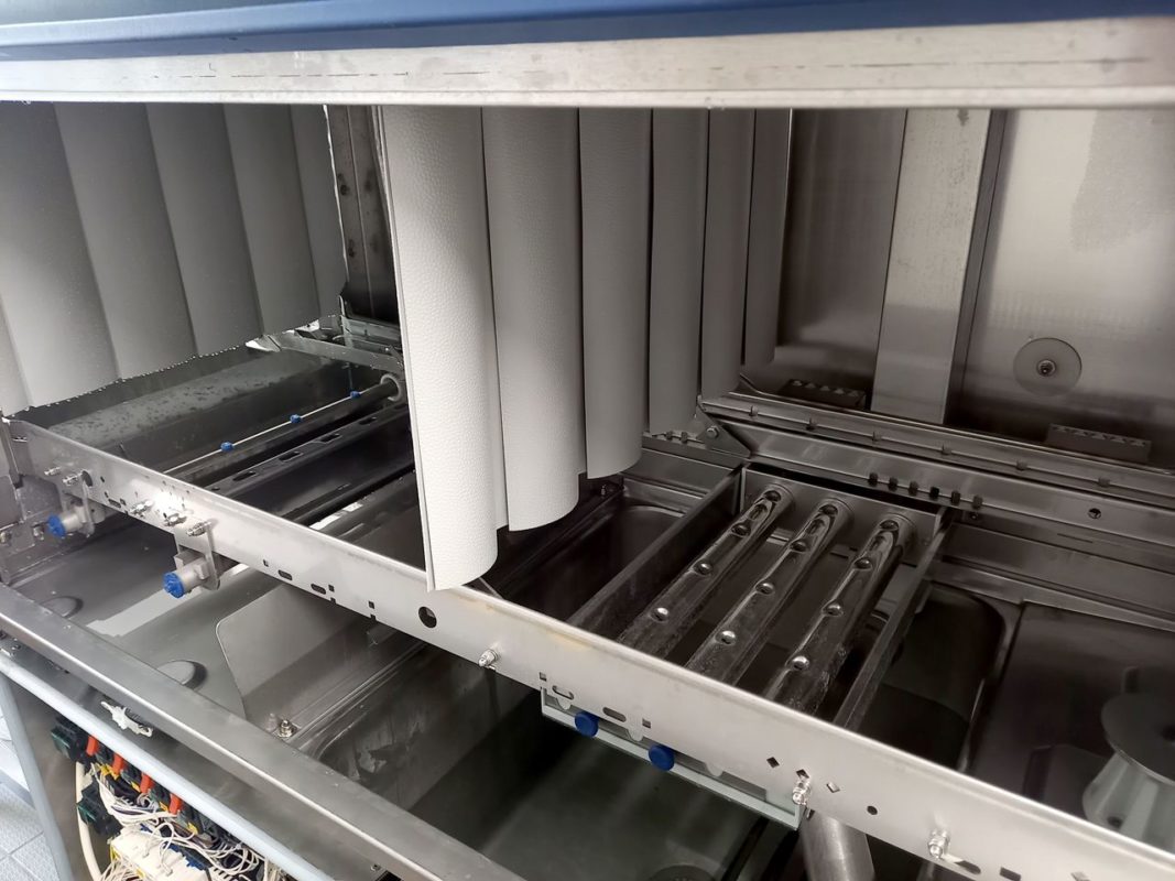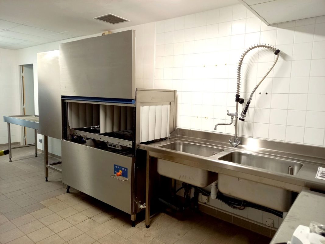L’ensemble de lavage, rendu cohérent par rapport à l’ancienne installation: le poste de trempage / prélavage deux bacs avec douchette, à glissement, permet une introduction directe des casiers en zône de lavage par simple poussée. Le lavage à +/- 65°Cet le rinçage à +/- 85°C donnent sur le tunnel de séchage avec condenseur récupérateur de buées. La fluidité du service est obtenue par une longue table de sortie à rouleaux, avec sécurité de fin de course, pour un séchage parfait de la vaisselle.